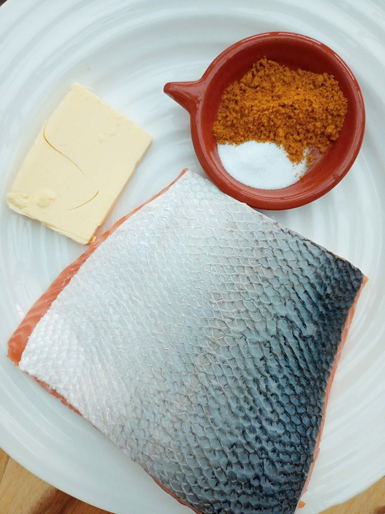 - Divide the salmon into 4 fillets then rub a little mix onto the cut sides. Melt the butter in a large skillet over a medium high heat and once it’s foaming add the salmon, skin down to the pan. Gently press the salmon flesh so that the skin is flush with the pan.