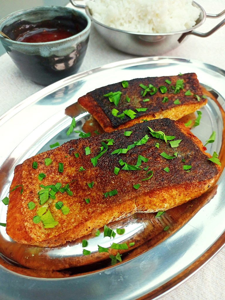- If you want edible crispy skin then scrape all the scales off with a sharp knife, otherwise just dry the salmon with paper towel. Mix together the garam masala and salt then sprinkle onto a plate and coat the salmon, rubbing the mix into the skin.