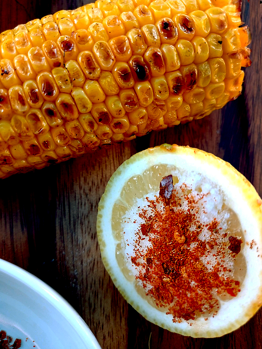 Most Brits will have eaten corn on the cob that’s been boiled then served with a knob of butter (which is good) but the absolute best way to cook it is on the BBQ. It’s incredibly easy to cook corn on the BBQ then you get to add the most fantastic flavour bomb with lemon, salt and chilli powder. You can serve the corn whole on the cob, with a lemon half for each diner, or slice off the cooked kernels then squeeze over the lemon, sprinkle over the salt and spice then toss and serve as a side dish.
