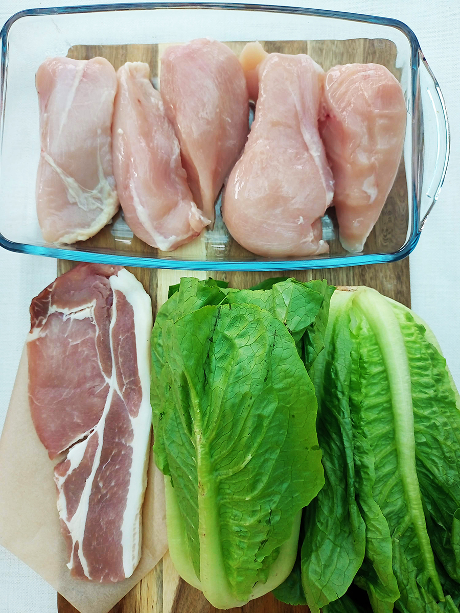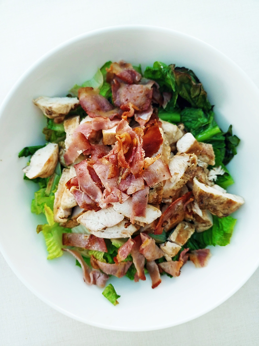 - Once cooked, chop the chicken, lettuce and bacon into bite-sized pieces then place in a serving bowl and drizzle over the dressing then toss to coat.
