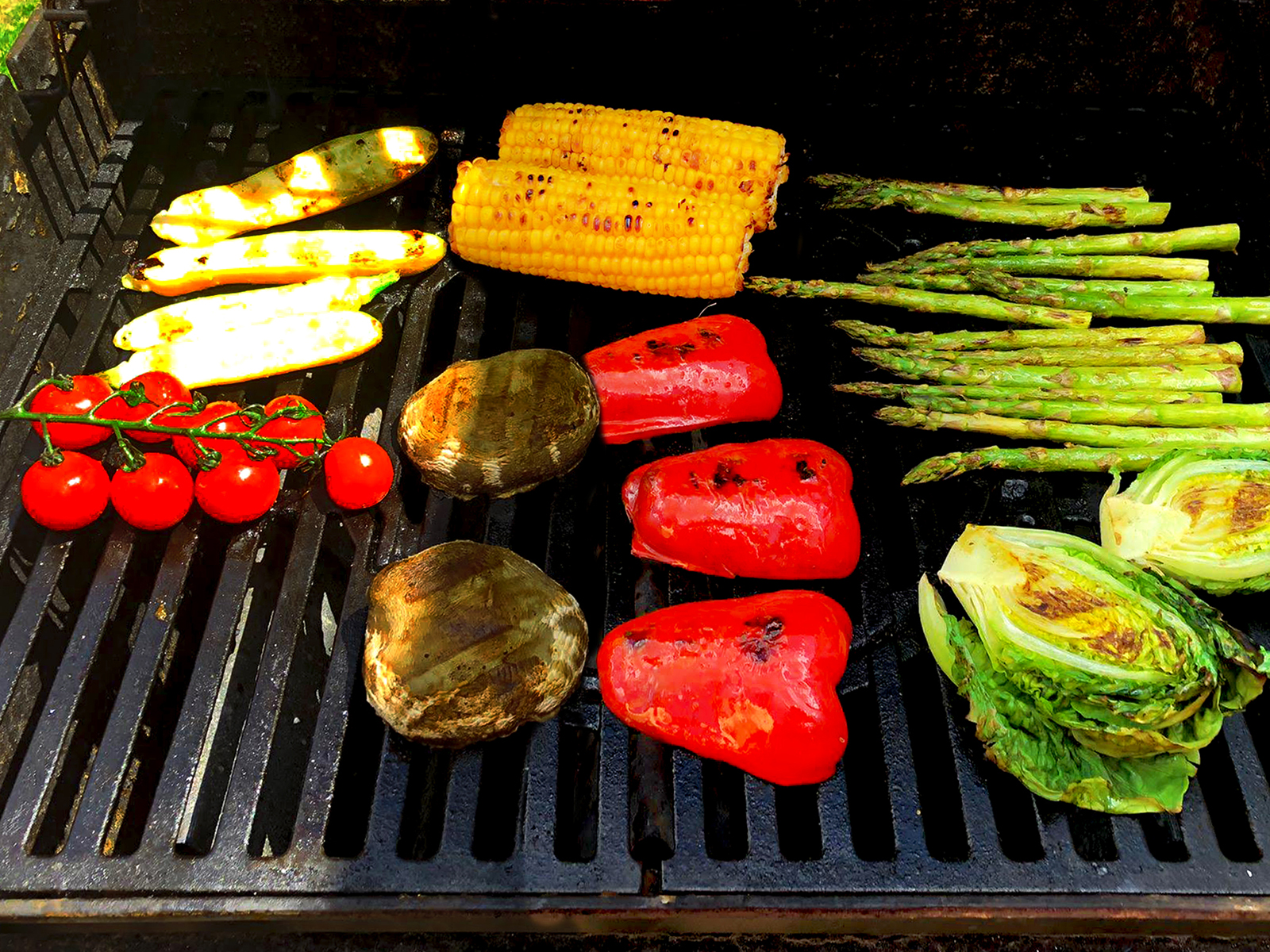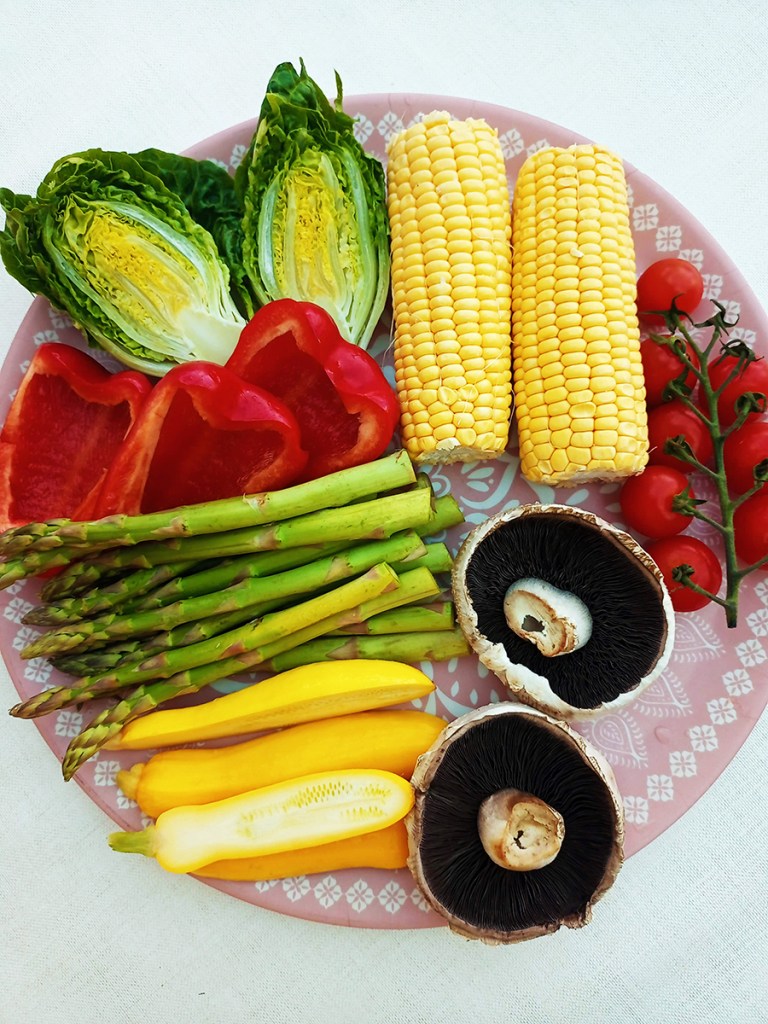 - Pre-heat the BBQ to 180-200°. Start with the corn which will need 12-15 minutes then add the courgette that will need 10 minutes. Add the mushrooms, tomatoes, asparagus and peppers which will all cook in roughly 8 minutes then the lettuce which will take 5 minutes. Turn the asparagus regularly and everything else once. Serve on a large tray or platter.