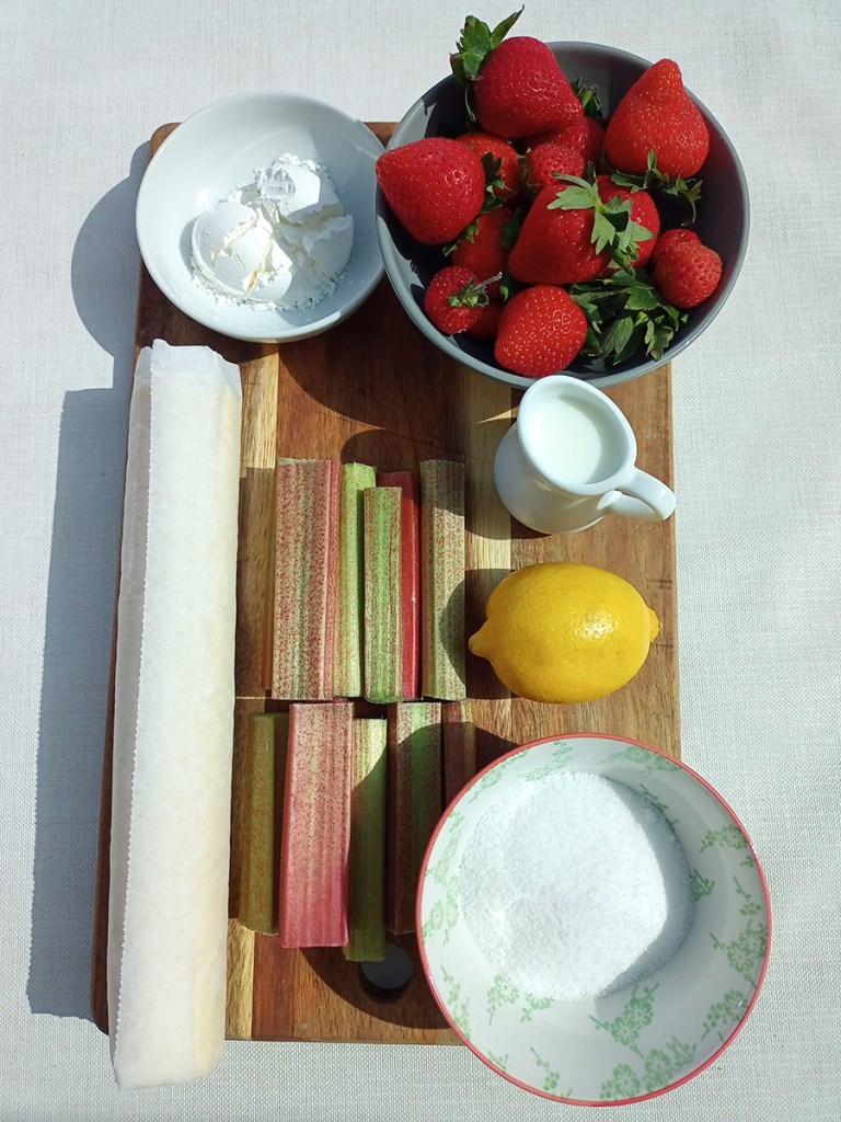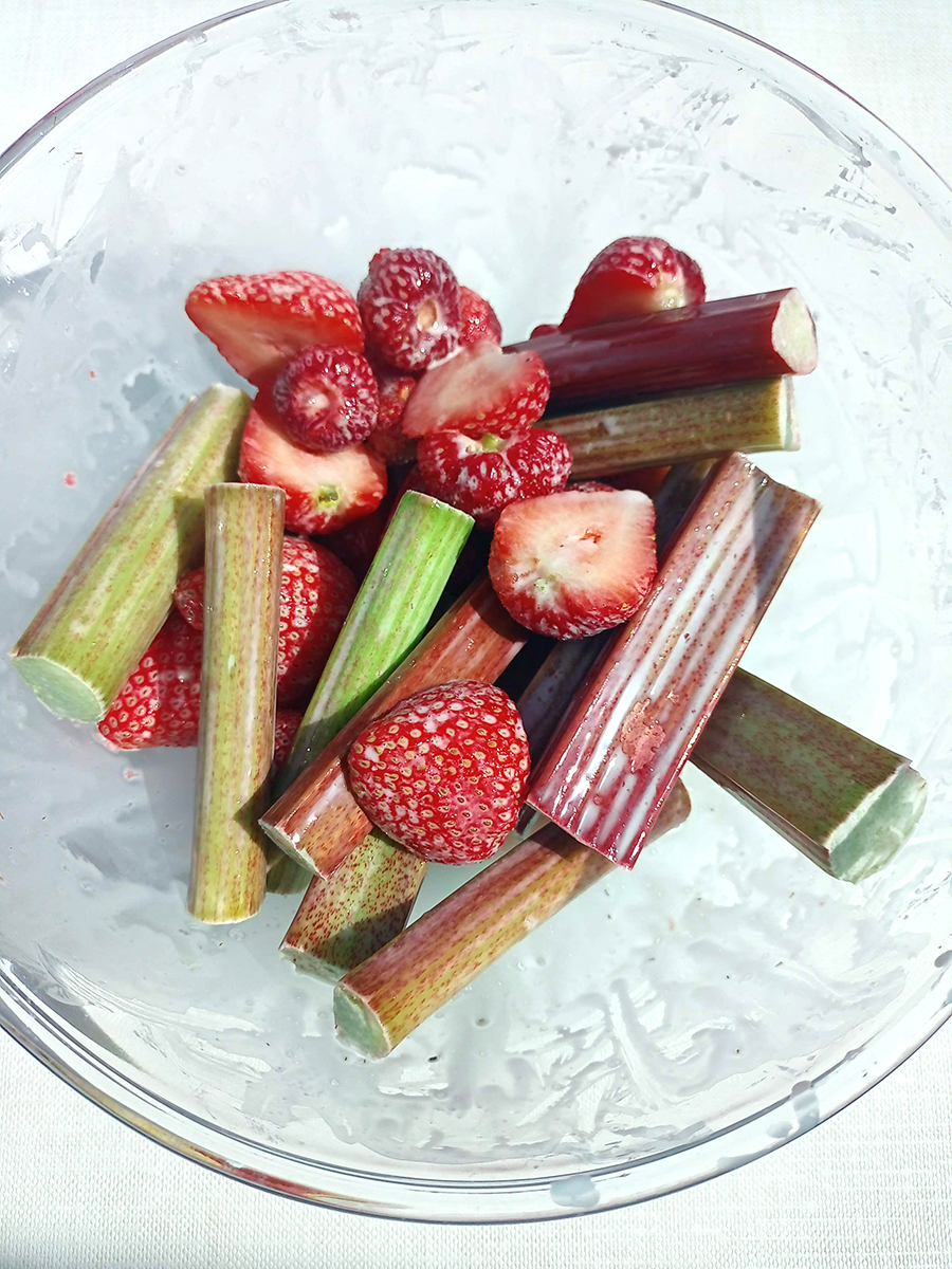 - Pre-heat the oven to 190°C (170°C Fan). Cut the rhubarb into thirds and remove the stalks from the strawberries. Cut the bigger strawberries in half and leave the smaller ones whole. Put all the fruit into a mixing bowl then sprinkle over the cornstarch and squeeze in the juice of two lemons. Mix with a metal spoon then leave until the blind baking is done.