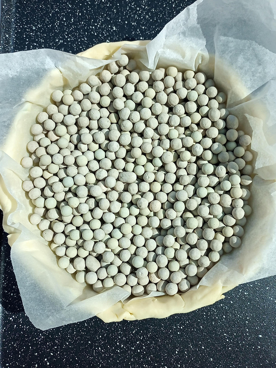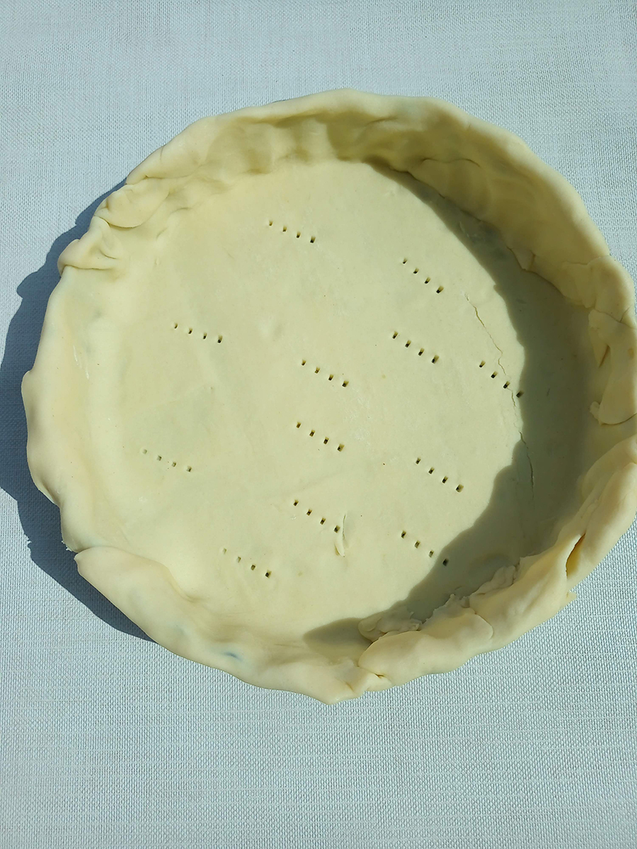 - Butter a spring bottom tart tin then lay 3/4 of the pastry over and gently press into the tin. Prick the bottom all over with a fork. Scrunch up a piece of greaseproof paper (I use the piece included in the pre-made pastry) then flatten it out and place over the pastry before pouring over the ceramic beans. Pop the tin into the hot oven and blind bake for 10 minutes.