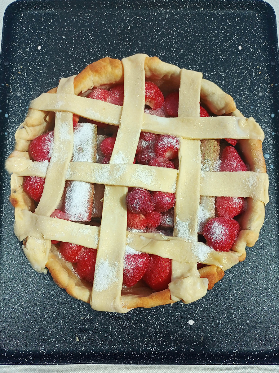 - Remove the ceramic beans and paper then arrange the rhubarb and strawberries neatly in the pastry case. Sprinkle the sugar over all the fruit. Cut the remaining 1/4 of the pastry into strips then crisscross over the top of the tart. Brush the strips with a little milk then sprinkle with some extra sugar. Cover the edges of the pie with foil to protect from burning then place back in the oven for 35-40 minutes until the pastry is completely cooked and the fruit is soft.