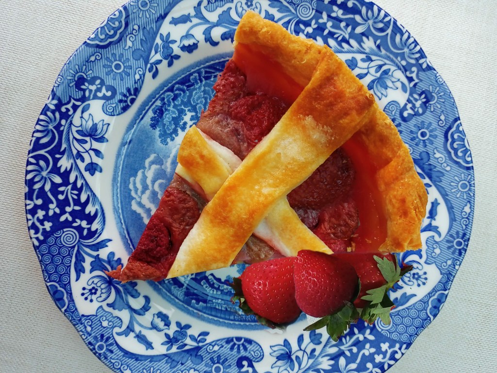Our strawberry plants grow a range of sizes some of which aren’t the right size or texture for eating as a snack because they’re too small or too big so I use them up in this simple and delicious tart. The sweetness of the strawberries and the slight tartness of the rhubarb are great friends and made sublime with a glug of custard or single cream. I’m too inept to make pastry in the week so I use pre-made but if you have the skills to make your own pastry then I salute you.