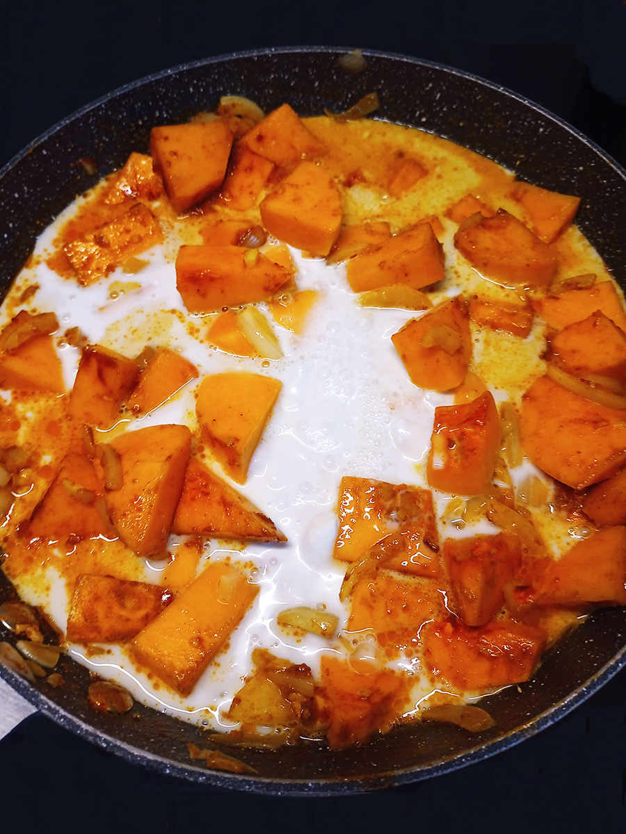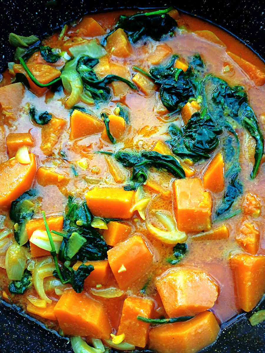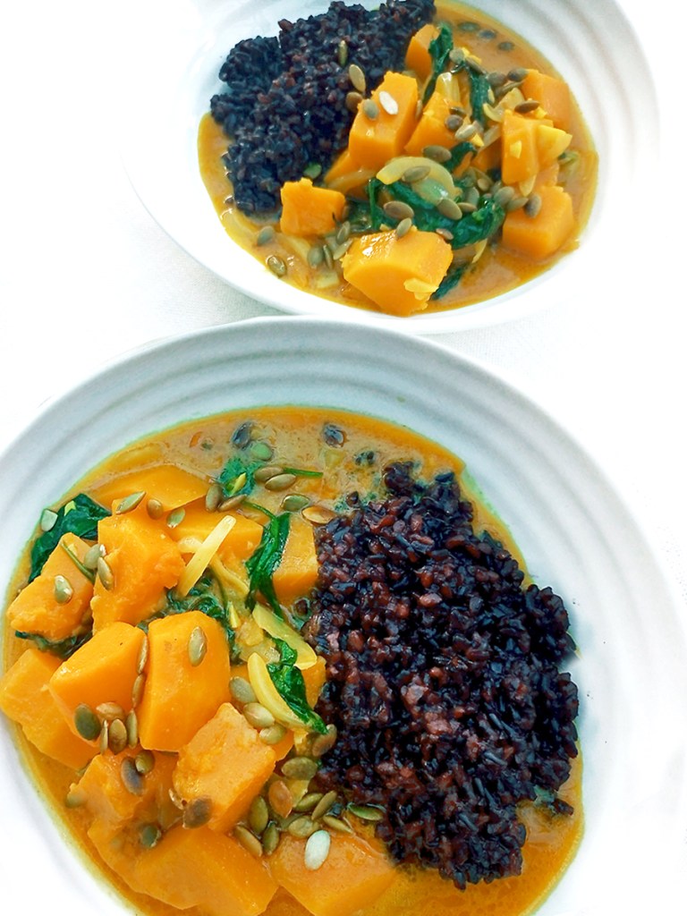 - Add the butternut squash, turmeric and curry paste (or powder) then stir before adding the coconut milk and stirring again to combine. Place a lid on the pan and gently boil for 10 minutes before adding the spinach and cooking for another 3 minutes with the lid on. Whilst the squash is cooking, toast the pumpkin seeds in a dry, hot pan for 3 minutes tossing occasionally. Serve the curry with the rice and sprinkle with the toasted pumpkin seeds.