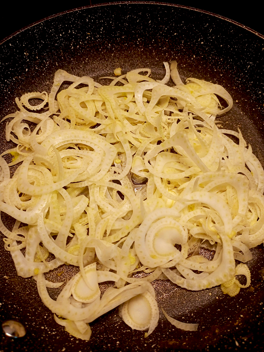 - Pre-heat the oven to 220°C (200°C Fan) with a shelf on a high shelf. Cut the root off the fennel then shave it into thin slices on a grater or mandolin. Stop slicing before you get to the fingers of the fennel. Add the oil to a frying pan over a medium high heat then add the fennel and stir regularly.