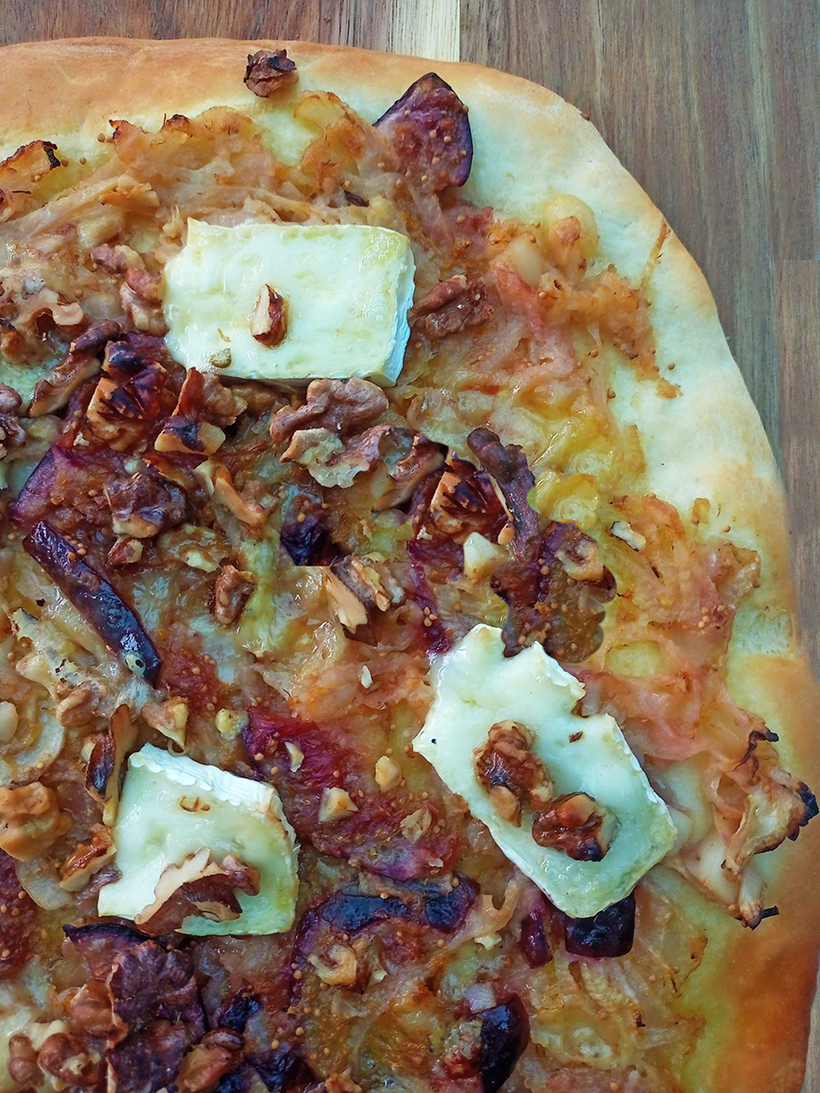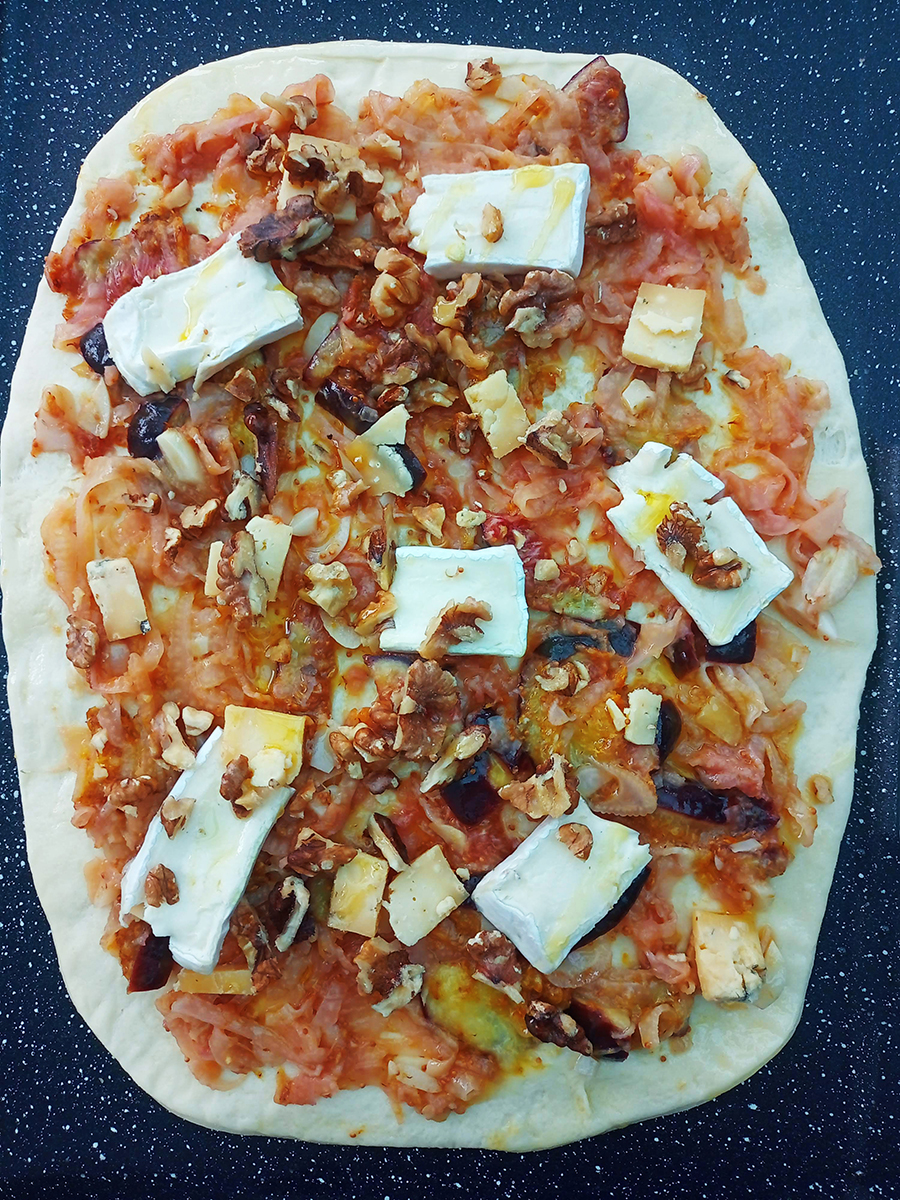 - Crumbled over the stilton then place slices of brie over the pizza. Roughly chop the walnuts then scatter over the top. Finish with a little drizzle of olive oil and pop in the oven for 15 minutes. For a little extra sweetness drizzle some honey over the hot pizza.