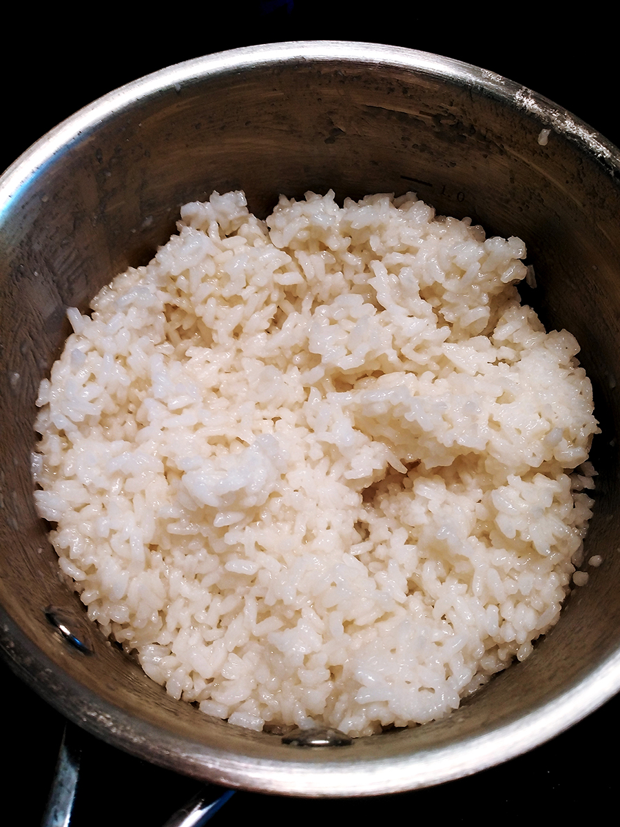 - In another small saucepan add the oil, vinegar, salt and sugar then stir until the sugar is dissolved then set aside until the rice is cooked and cooled. Once the rice is cooled pour over the liquid and stir then let it absorb for 20 minutes before shaping.