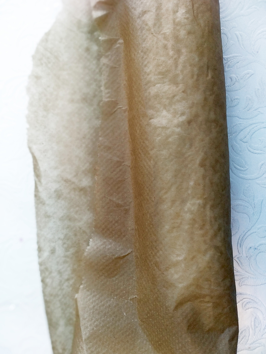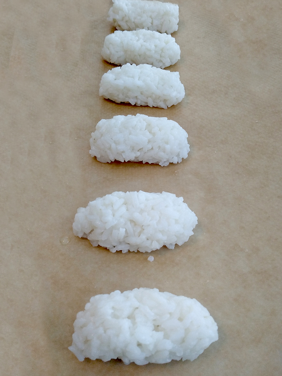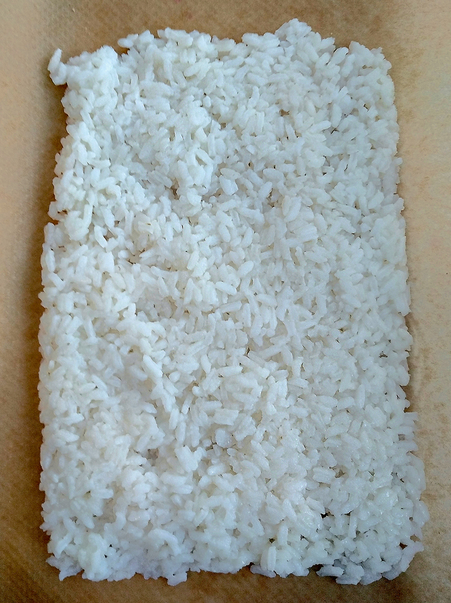 - Spoon the cooled, seasoned rice onto a large piece of greaseproof paper then use the edges of the paper to make the rice into a 20x10cm rectangle.