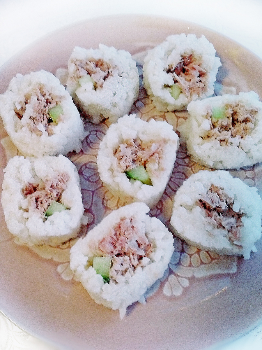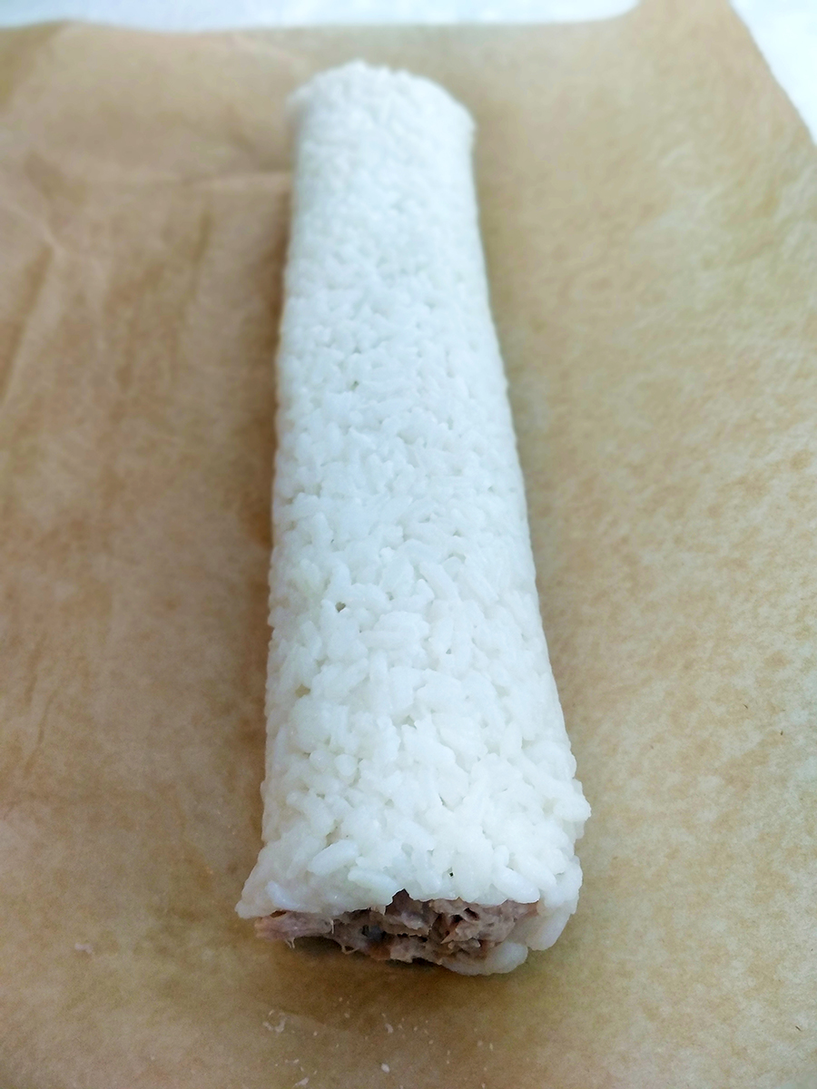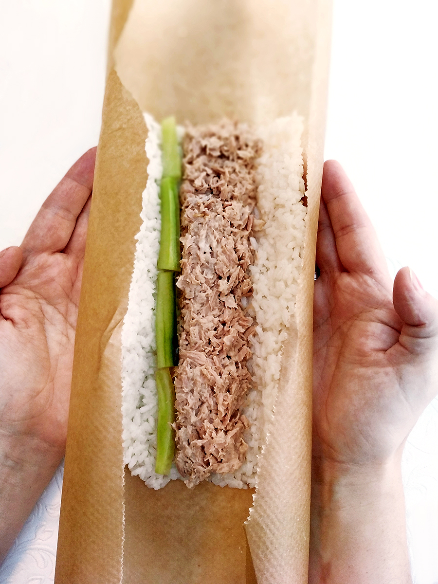 - Drain a tin of tuna then mix with mayonnaise and grind over with salt. Spoon a line of tuna mayo in the centre of the rice then line with narrow strips of cucumber. Slide your hands under each side of the paper and form the rice into a roll and press the edges together. Gently roll the sushi roll on the surface then remove the greaseproof paper and slice into sections.