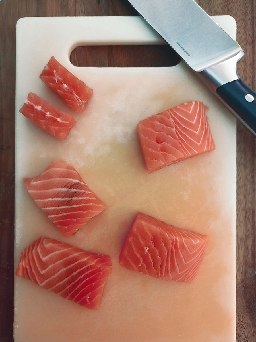 - Use previously frozen, farmed salmon to make nigiri. This ensures any bacteria has been killed. Remove the vertical vein from the fillet then cut across the grain (not in the same direction as the fat lines) to make sushi sized pieces.