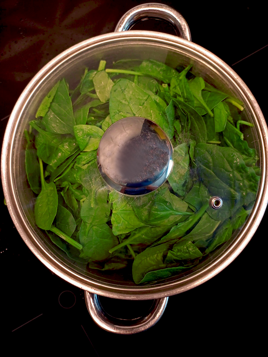 - Wilt the spinach in a saucepan with a lid over a medium heat. Once the spinach has shrunk take it out of the pan, run it under a cold tap then squeeze out as much moisture as possible.