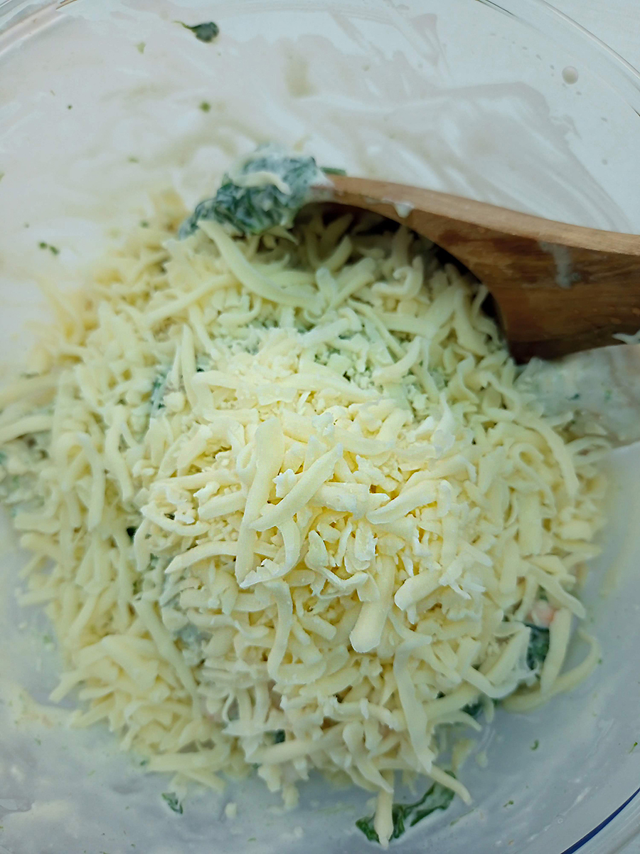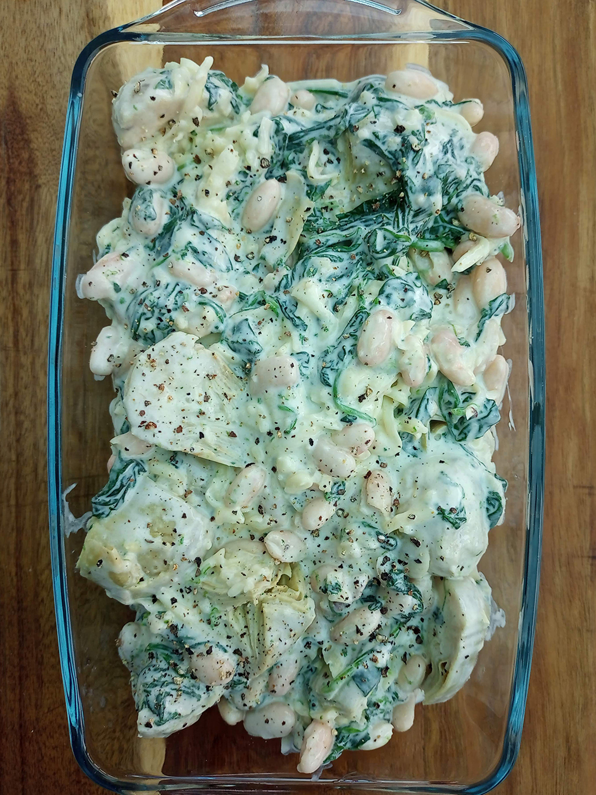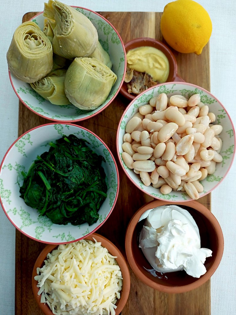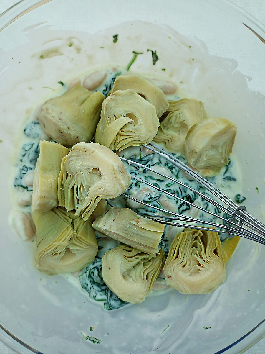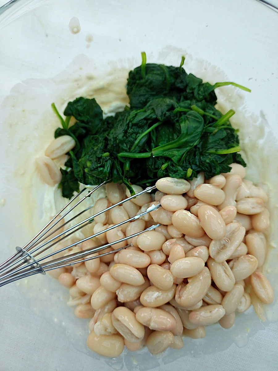 - Mix together the cream cheese, mustard, garlic, salt and lemon juice in a medium sized bowl then add the spinach and drained cannellini beans. Stir the spinach and beans into the cheese mixture then add the drained, squeezed artichoke hearts and fold into the mixture. Add the grated mozzarella and stir again.