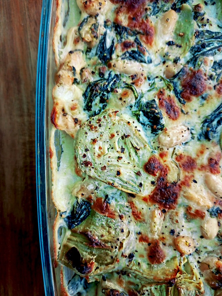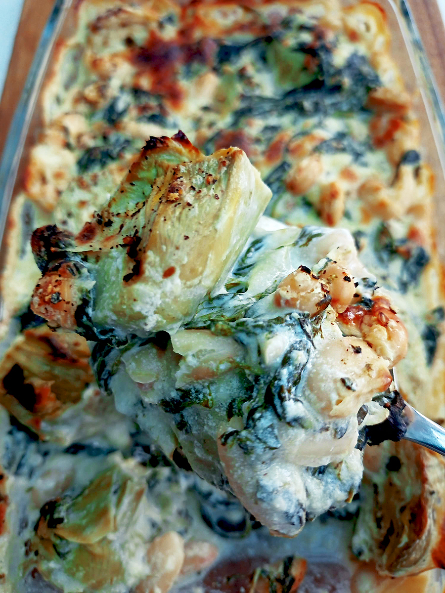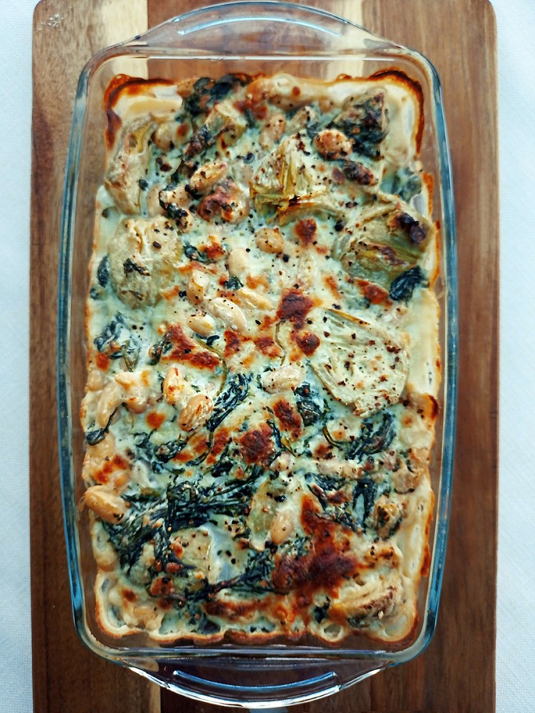 I make this delicious side dish to serve with roasted pork loin, roasted salmon or roasted cauliflower. Artichoke, Spinach and Cannellini Bake has a great dose of iron, protein and calcium so it’s full of nutritional ingredients smothered in a cheese sauce which makes it my kind of dish. As I’ve confessed before I simply don’t have the patience to core artichokes so I use tinned artichoke hearts to save time. You need to squeeze out as much liquid as possible from the artichokes so that it doesn’t thin out the cheese sauce. Same goes for the spinach, give it a good squeeze before adding to the bake. Any leftovers will keep in the fridge and can be reheated gently in the microwave.