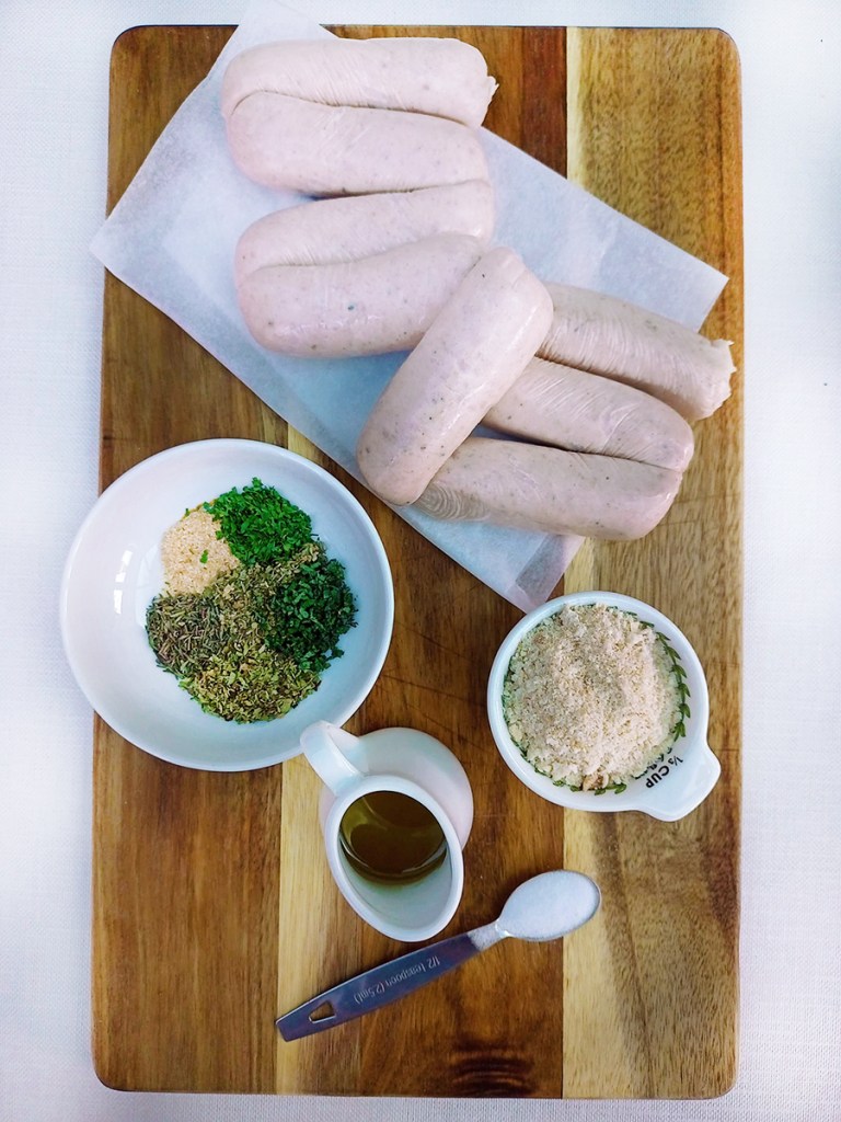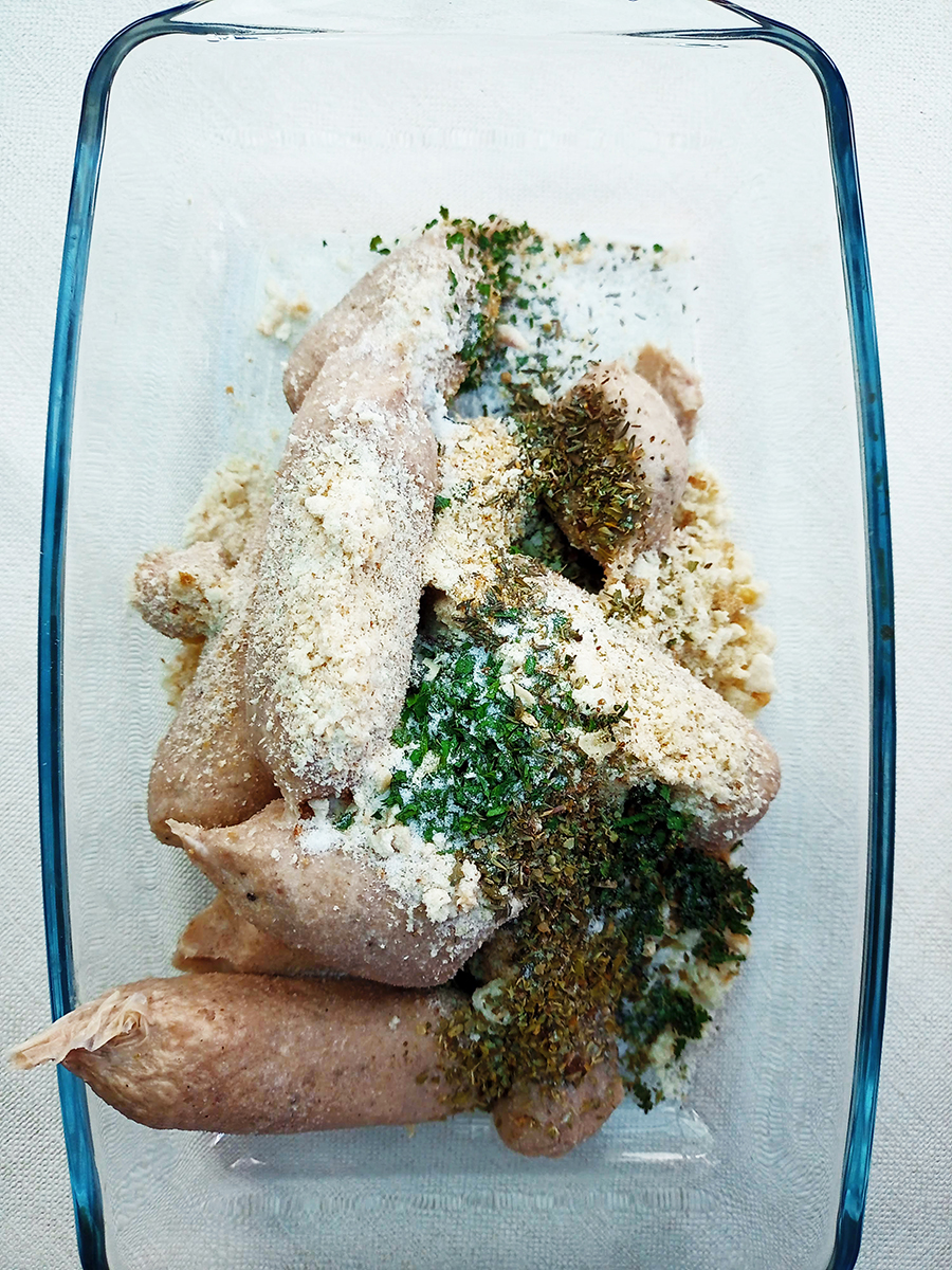 - Pre-heat the oven to 220° (200° Fan). Squeeze the sausage meat out of its casing into a small baking dish then add the breadcrumbs, herbs and salt.