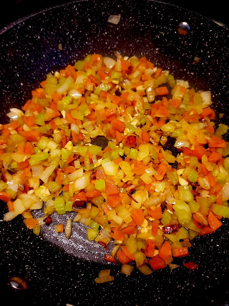 - Peel and finely chop the onion, carrots and celery. Add the oil to a large skillet over a medium to medium high heat then add the chopped veggies then sprinkle over with half the salt and cook for 8-10 minutes. Add the chopped garlic and cook for another 2 minutes.
