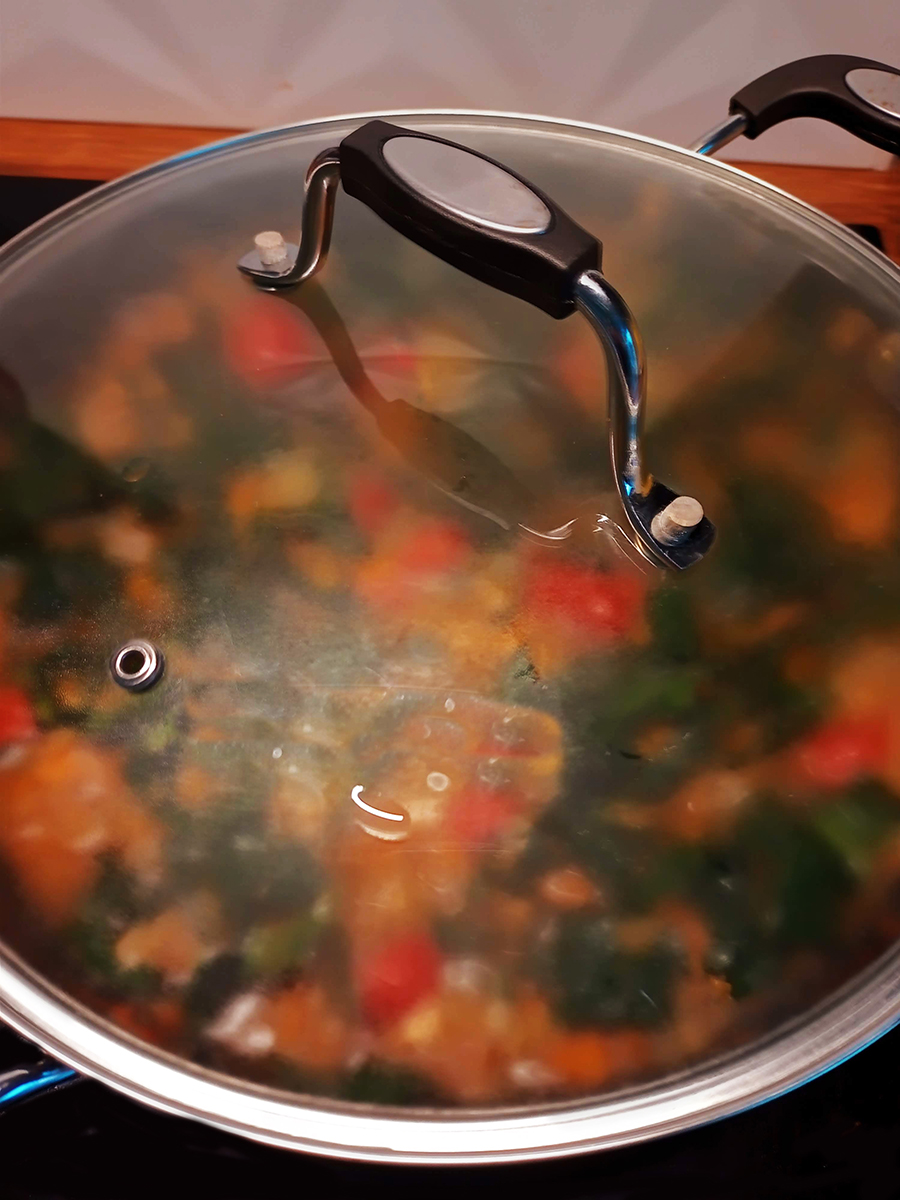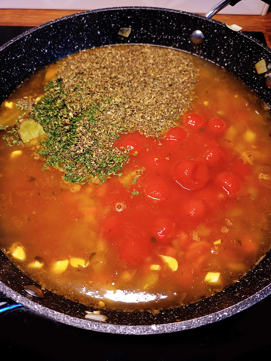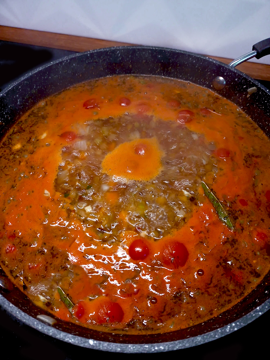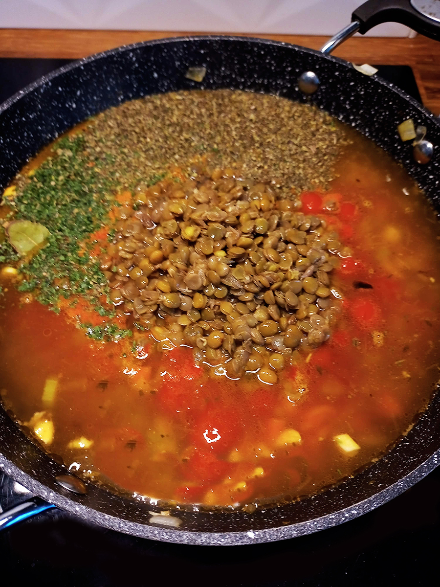 - Add the stock, herbs, chilli flakes the rest of the salt, pepper, tomatoes and lentils. Stir and bring everything to the boil then turn the heat down and simmer (small, slow bubbles breaking the surface of the liquid) for 20 minutes.