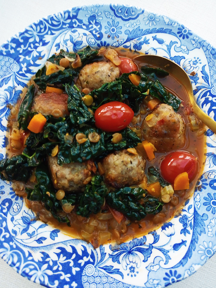 As the name suggests, Lentil and Cavolo Nero Stew is incredibly good for you but thankfully it’s also delicious. Life’s too short to eat something healthy that doesn’t also taste fantastic. Cavolo Nero is the Italian cousin of Curly Kale and it’s packed full of iron and Vitamins K, A, C and B. Cavolo Nero leaves are tender and delicious but the stalks are incredibly tough so remove the stalks and use the leaves. The thing I love about this stew is that it’s delicious on its own but you can also add protein to it in the form of meatballs, chicken or sausage. If you can’t find Cavolo Nero then substitute for kale or savoy cabbage.