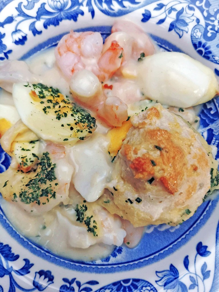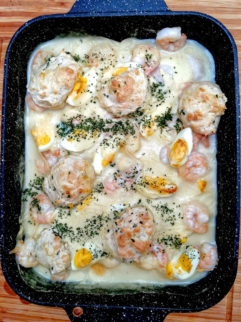 Akin to fish pie, Hake, Prawns and Dumplings is a comforting weeknight meal that delivers far more flavour than you’d expect. Little bread dumplings are easy to make and offer a lovely twist on the traditional potato topping. The bottoms soak up the beautiful sauce whilst the tops get toasty. Serve with green veggies for a beautiful and tasty family meal.