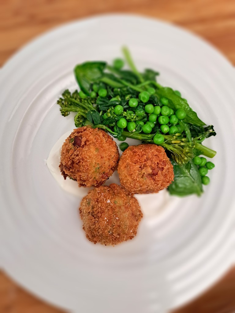 These little golden spheres will eternally have a special place in my heart as they won me the very first apron in my heat on MasterChef. I chose this simple food because it uses cheap ingredients to create something elegant and delicious. I think a lot of family cooking is beautiful, even more so when it uses uncomplicated ingredients to make something comforting, filling and enjoyable. The kids love these Ham and Pea Croquettes with beans and coleslaw whereas I like them with a warm or cold salad. However you like them, they’re a joy to eat all year round.