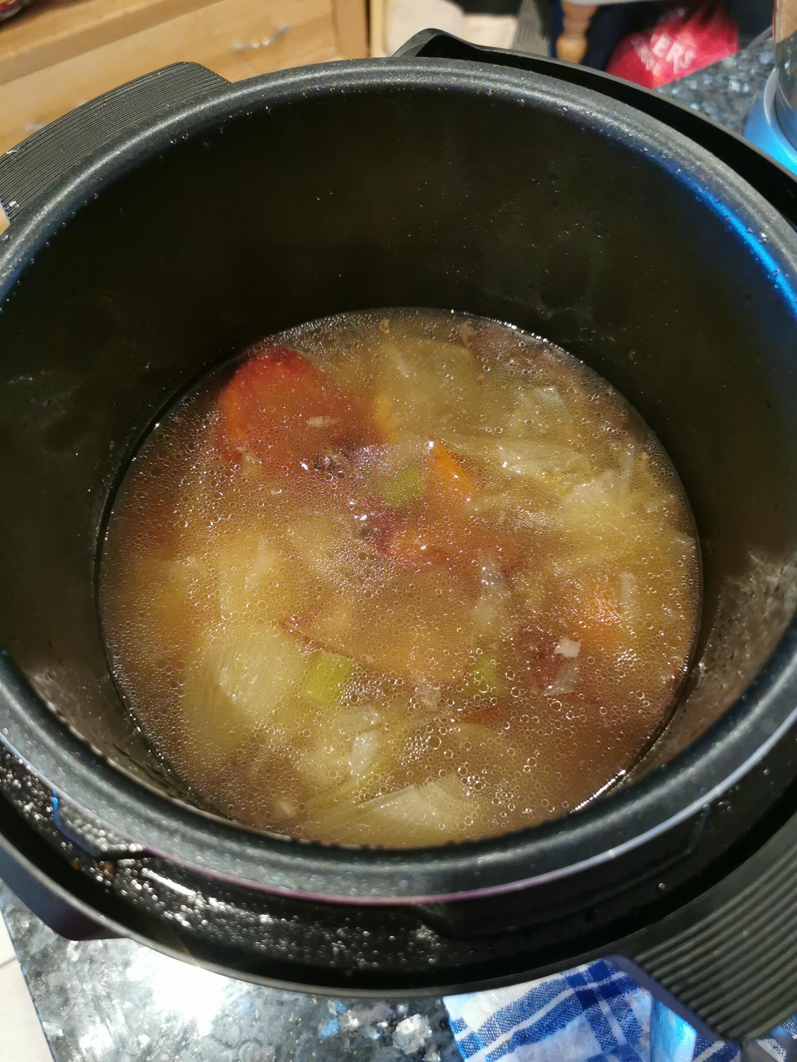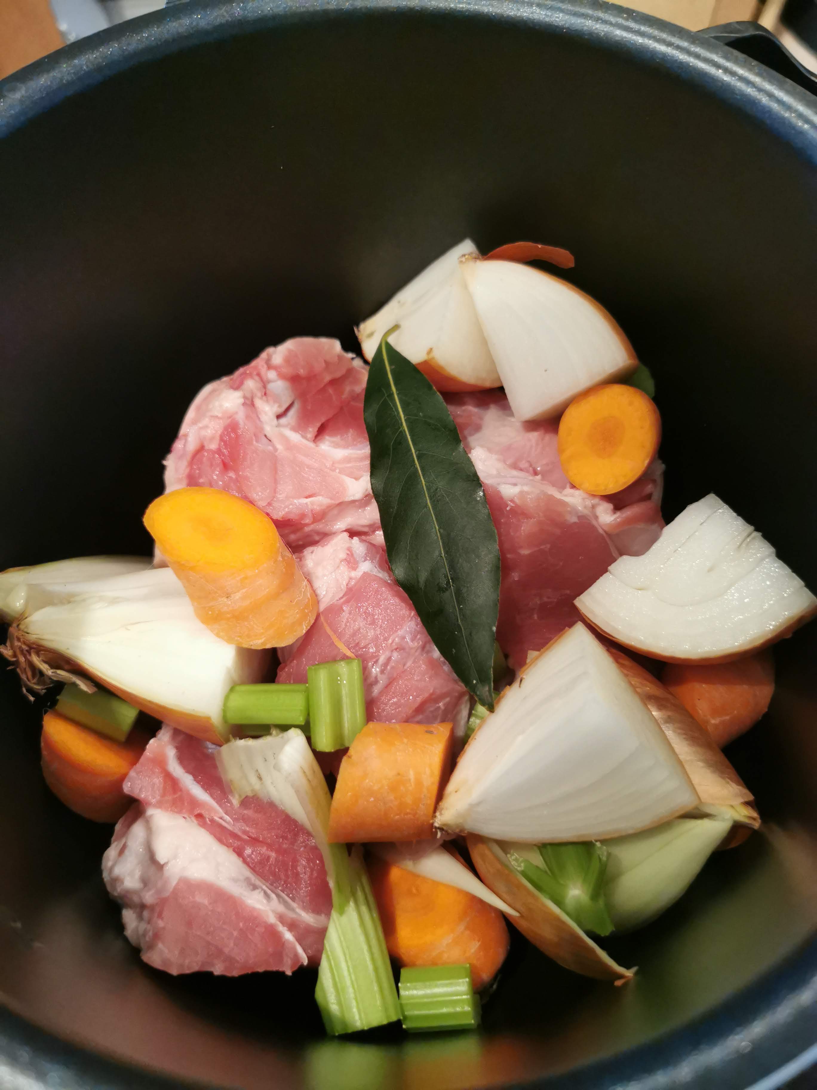 - Remove the skin from the ham hock and cut the flesh into equal thirds. Place the meat into the pressure cooker with the roughly chopped carrot, onion, celery, bay leaf and peppercorns. Cover with water and pressure cook for 60 minutes once at pressure.