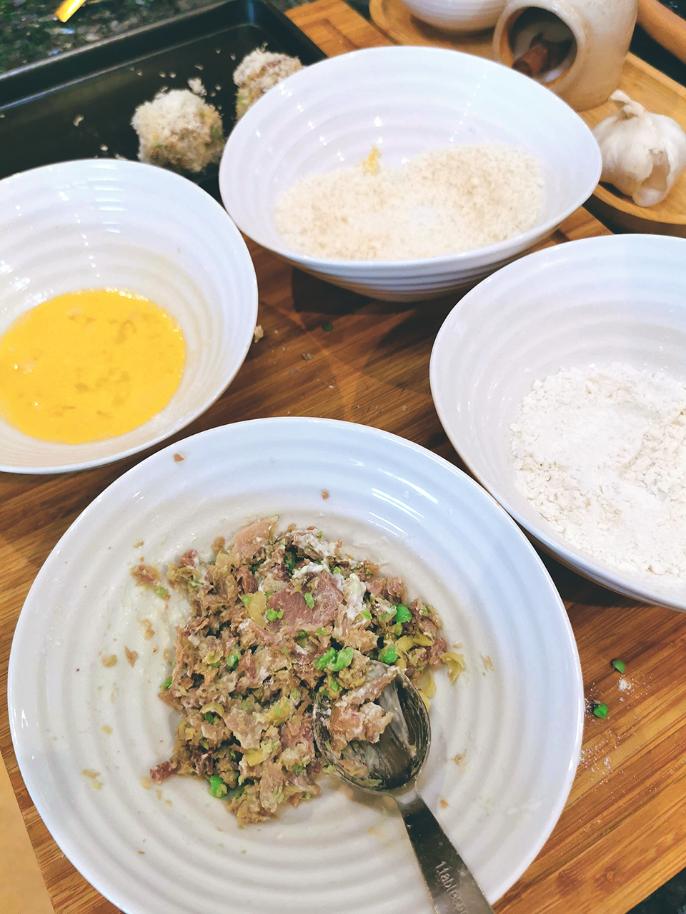 - Prepare three bowls of flour, whisked egg and panko. Roll the balls in the flour, then egg then panko breadcrumbs.