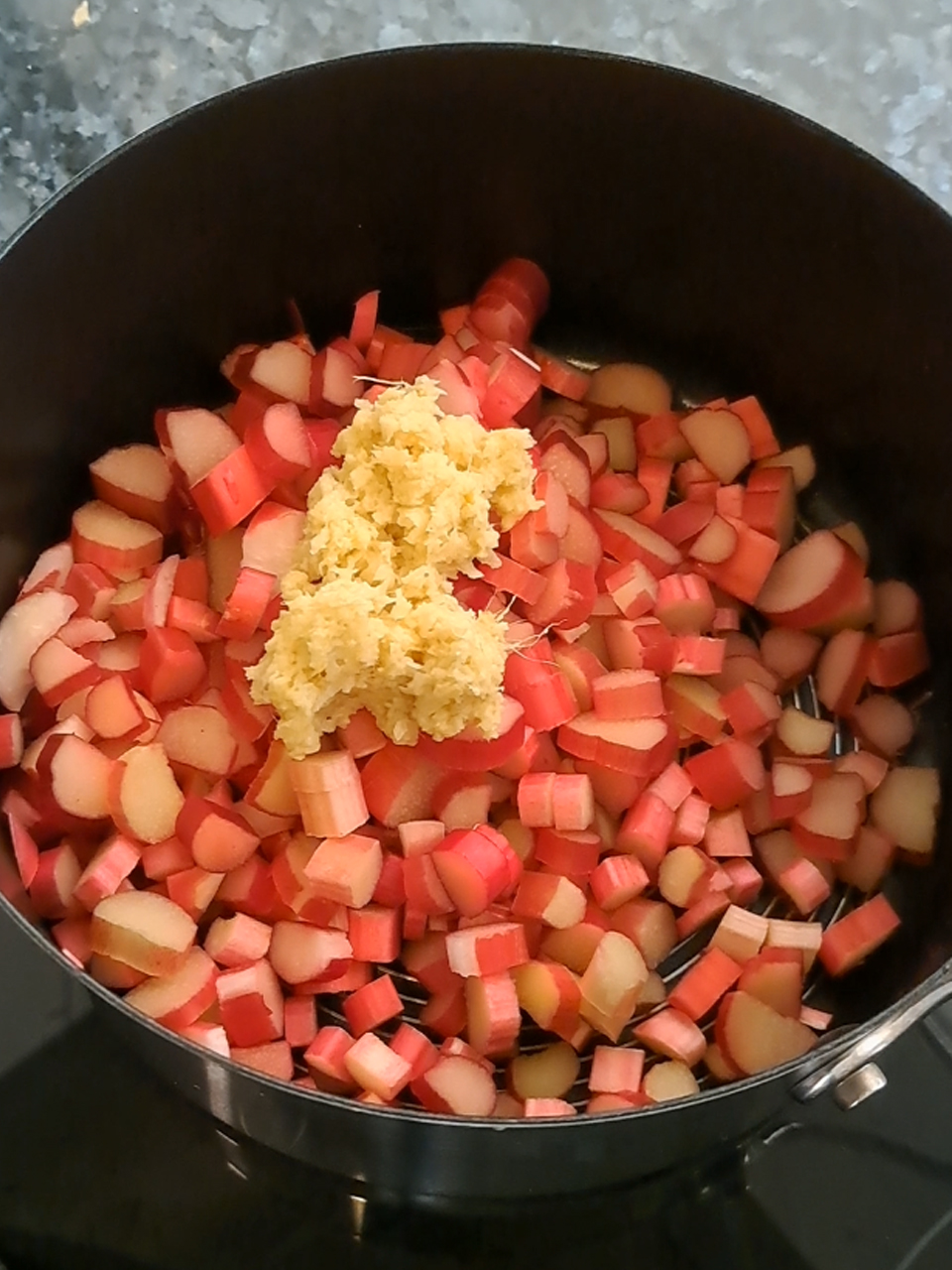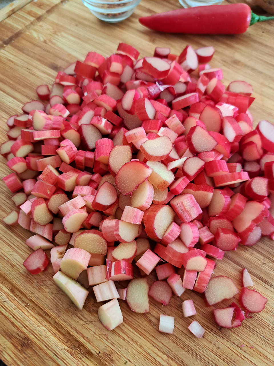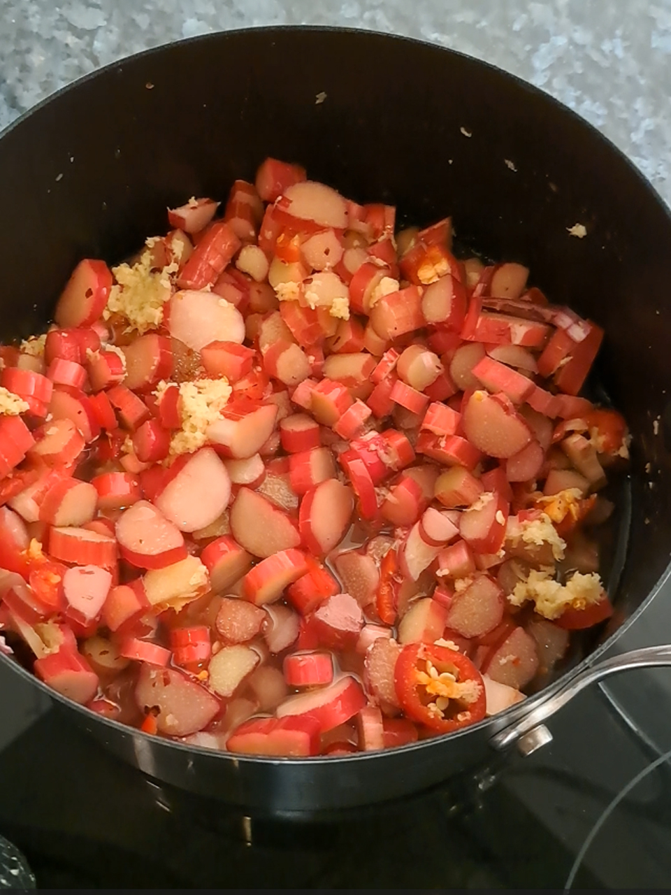 - Chop the rhubarb and add to a saucepan over a medium heat along with the deseeded chilli, grated ginger, vinegar and salt.