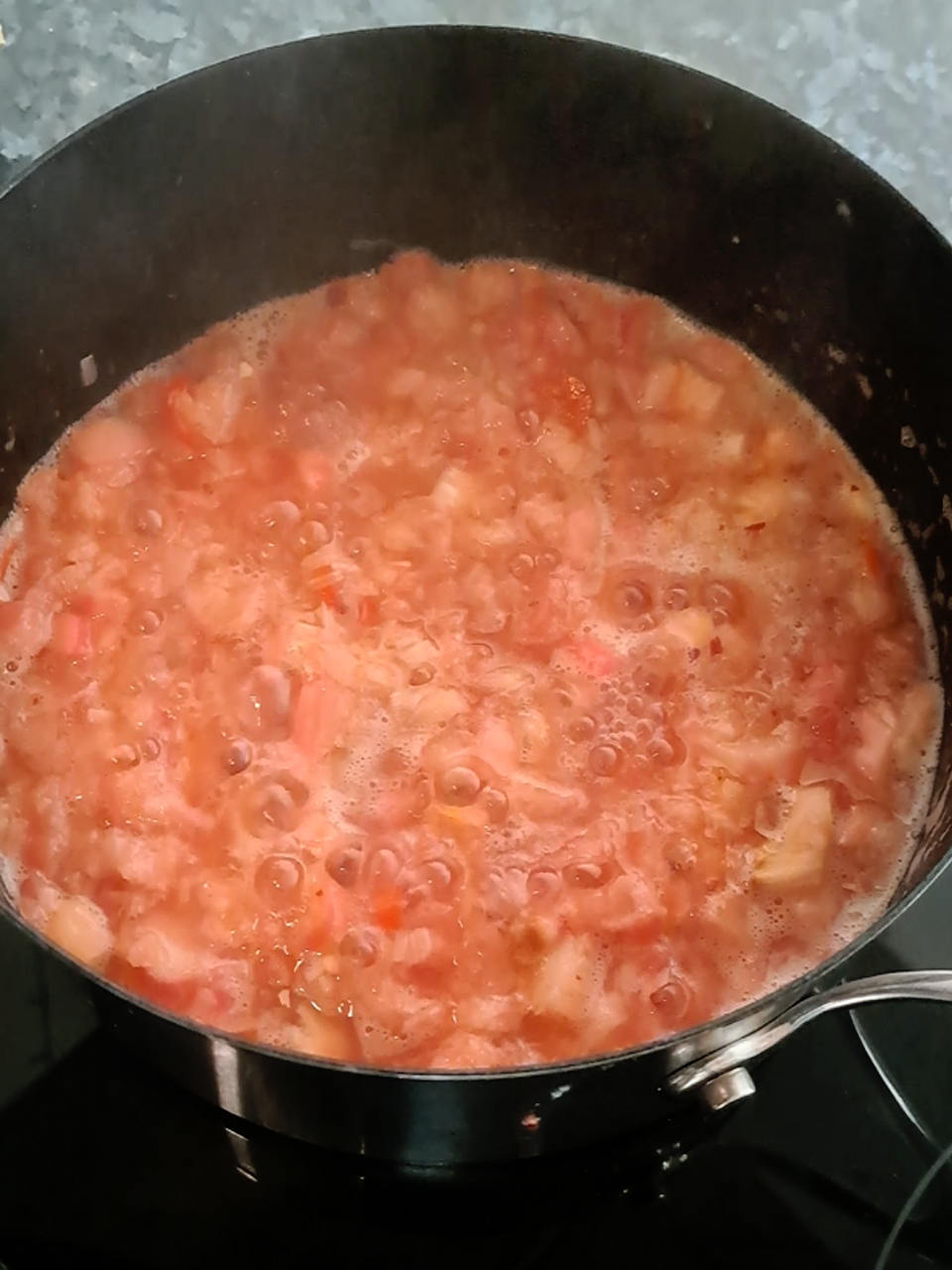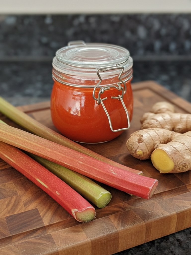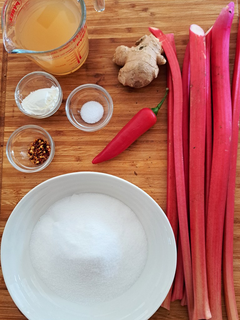 - Chop the rhubarb and add to a saucepan over a medium heat along with the deseeded chilli, grated ginger, vinegar and salt.