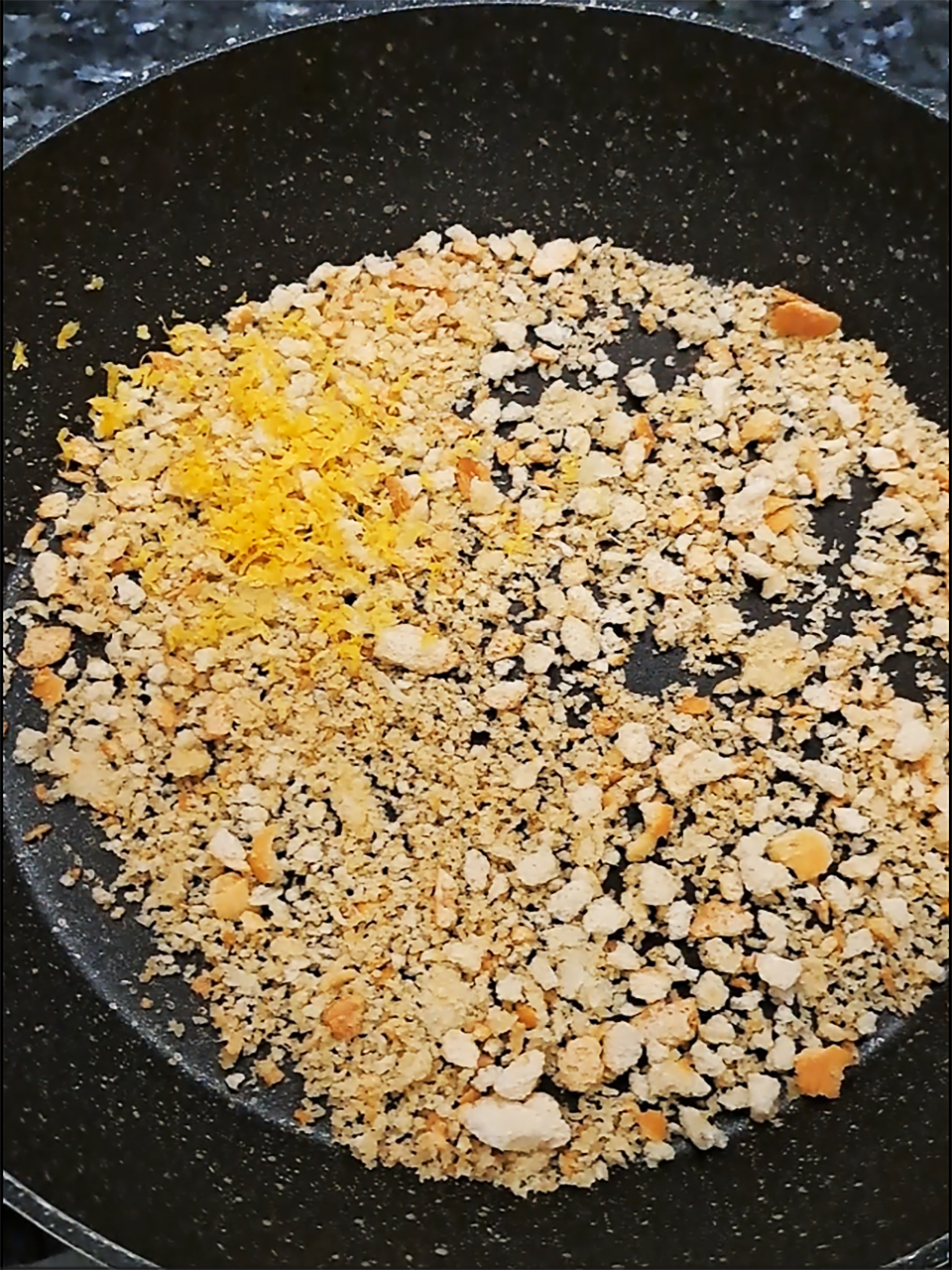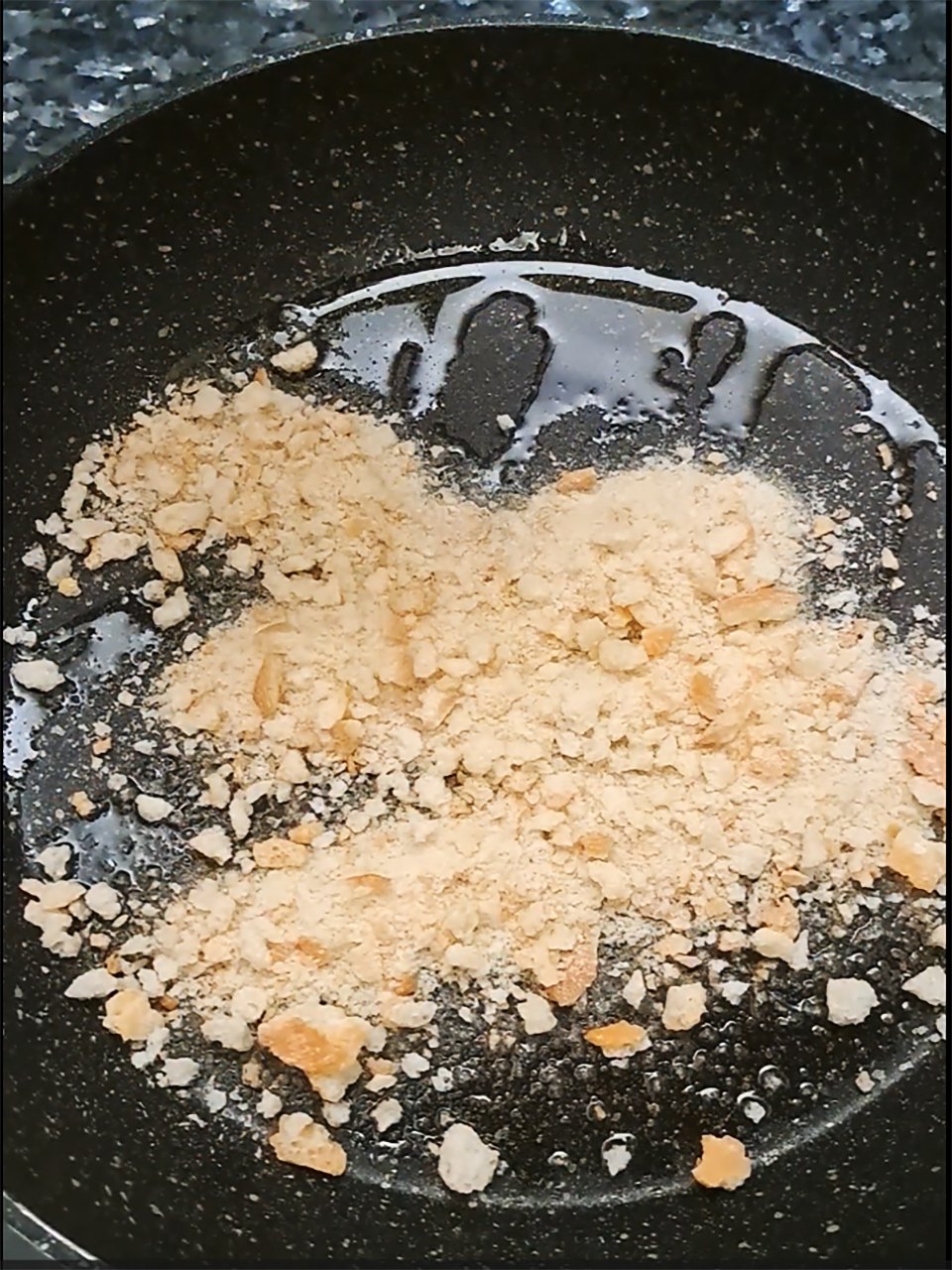 - Over a gentle, medium heat, toast the breadcrumbs in the olive oil.